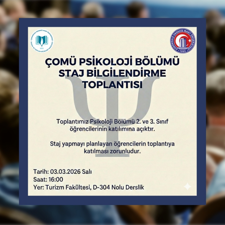 Bölümümüzde 03.03.2026 Salı günü saat 16.00’da Turizm Fakültesi D-304 nolu derslikte staj bilgilendirme toplantısı gerçekleştirilecektir.